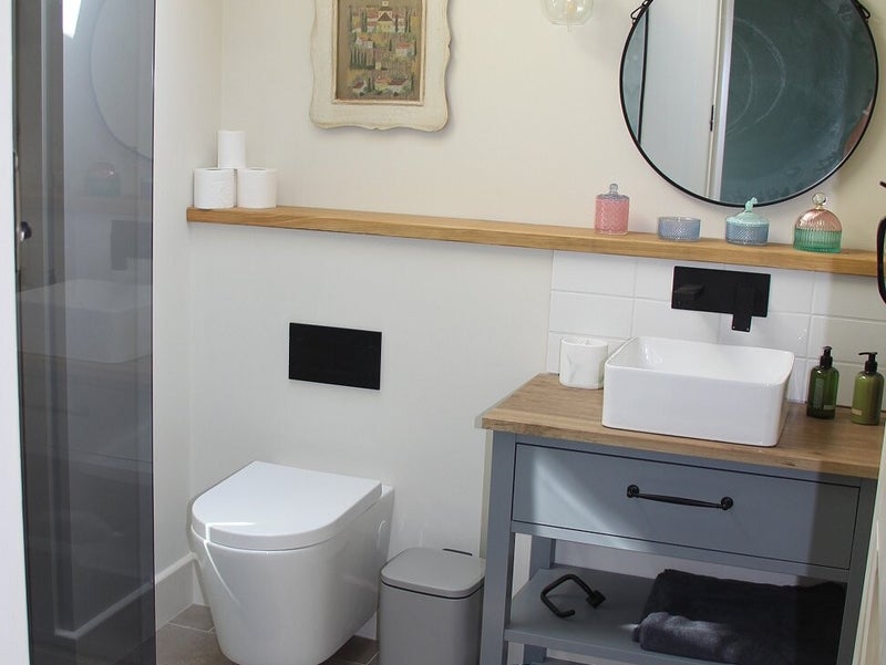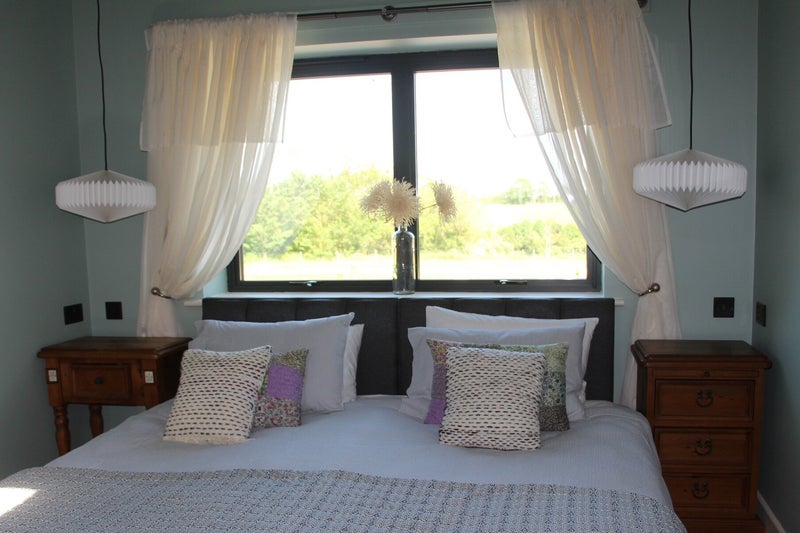The relaxing bedroom offers a Super Comfy Super King size bed, leading onto the en-suite shower room with large shower, vanity unit and wall hung loo. All bedding, luxury super king sized duvet, quality sheets, bath, hand towels, shampoo, conditioner, and liquid soap are all included in the price. Holly one of our many sheep keeping you entertained in our fields.
